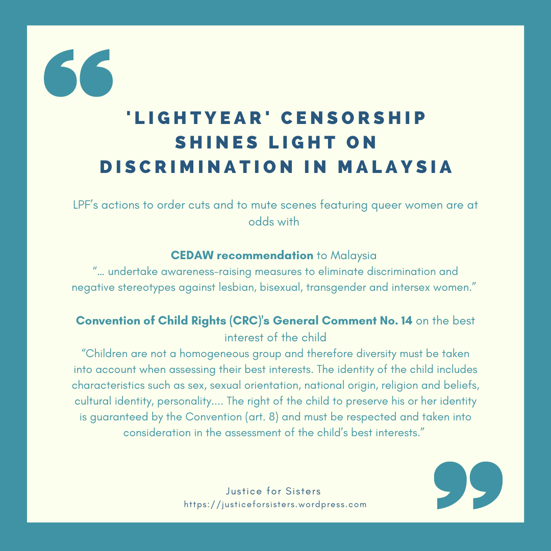 In Malaysia’s last CEDAW review, the CEDAW Committee recommended that Malaysia “… undertake awareness-raising measures to eliminate discrimination and negative stereotypes against lesbian, bisexual, transgender and intersex women.” LPF’s actions to order cuts and to mute scenes featuring queer women are at odds with the recommendation to Malaysia.
